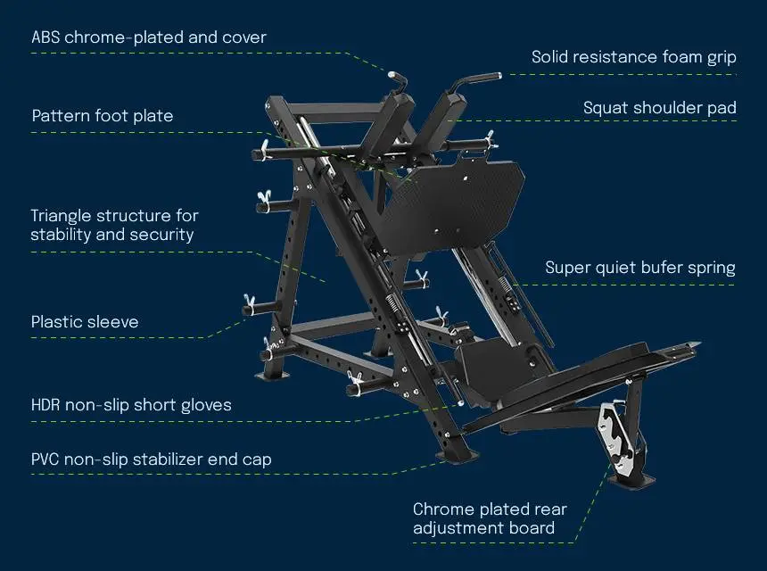 - Dimensioni della pedana per Hack Squat: 73,2 cm x 91,6 cm